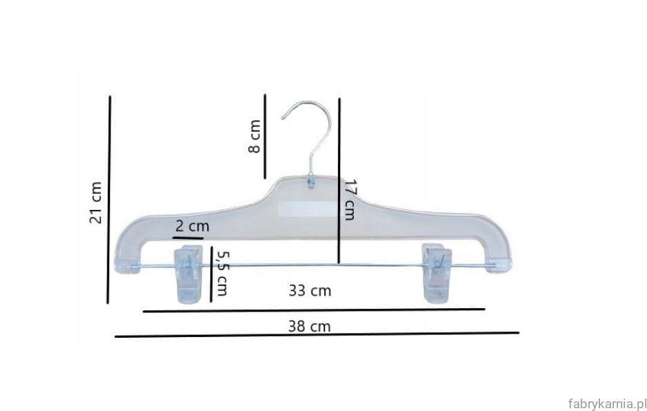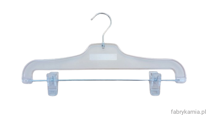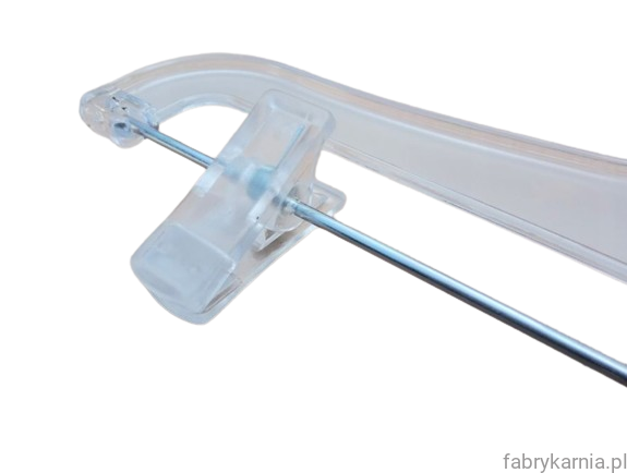 Wieszak odzieżowy z klamerkami wyprodukowany w całości w Polsce, z mocnego, półprzezroczystego tworzywa.